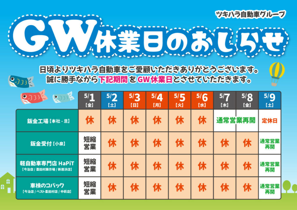 📅 [5/2㈯] 〜 [5/8㈮] まで休業